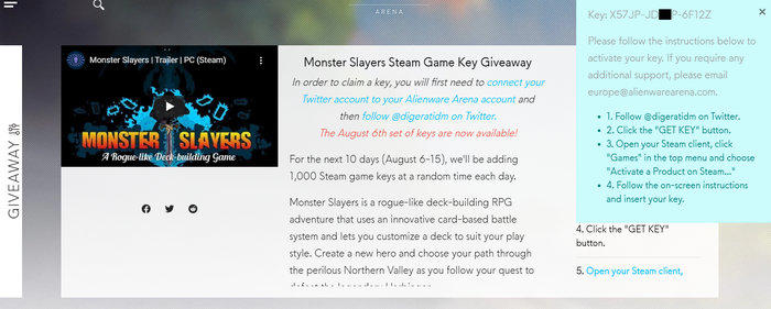 Для получения ключа необходимо перейти по ссылке на раздачу, залогиниться или создать аккаунт и нажать кнопку "GET KEY".