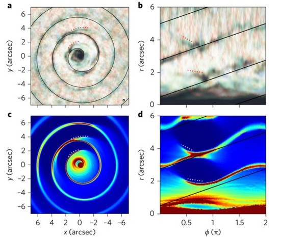 Гидродинамическое моделирование для системы с круговой орбитой звезды-компаньона предсказывает образование идеальной архимедовой спирали. Если же орбита обладает высокой эллиптичностью, то в спирали возникают дефекты-разветвления. Такие дефекты ученым удалось обнаружить в снимках ALMA.
