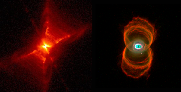 Планетарные туманности возникают на поздних этапах жизни звезд средней массы — красных гигантов. Их газовая оболочка начинает расширяться а сжимающееся ядро и горение остатков звездного топлива приводит к пульсациям светила, выбрасывающим газ в космос. В результате этого образуются газовые туманности различной формы — от сферически симметричных до напоминающих песочные часы, прямоугольники и более сложные фигуры.