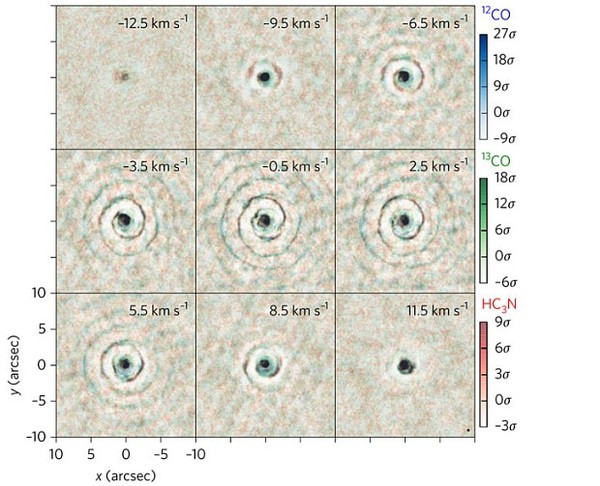 Астрономы наблюдали за туманностью в линиях, соответствующих излучению угарного газа и цианоацетилена. На основании доплеровского смещения линий излучения физики построили карту объекта с учетом скоростей газа. Оказалось, что спиральный мотив повторяют газовые облака, движущиеся с той же скоростью, что и LL Пегаса. Частицы, удаляющиеся или наоборот приближающиеся к Земле быстрее, чем двойная, формируют скорее концентрические окружности.
