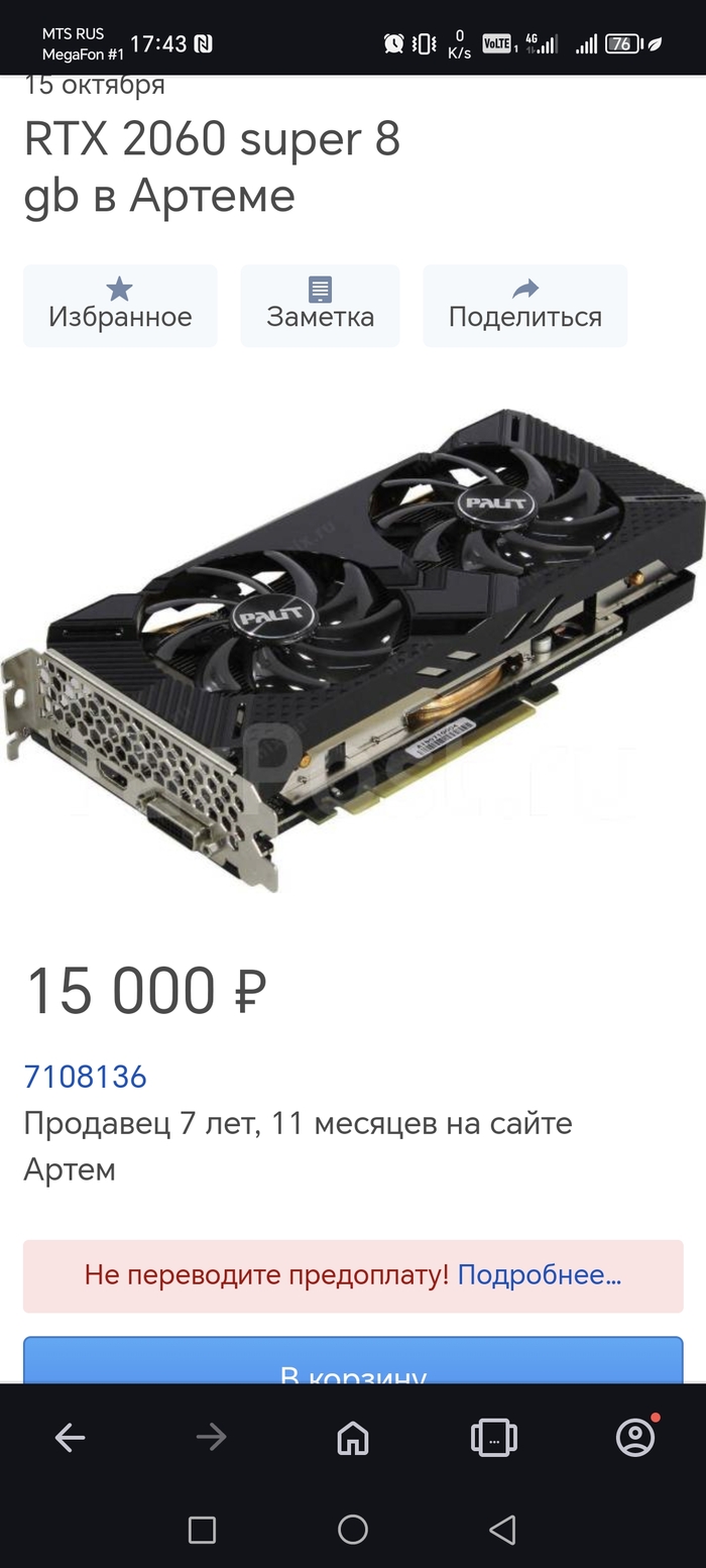 Исходя из ограничений бюджета видеокарту я решил поискать на вторичке. И таки нашёл вполне неплохой вариант от тех же зелёных rtx 2060 super в исполнении palit за 15к. Да, она б/у в отличии от конкурента. Но сами понимаете ограниченность бюджета. Почему именно эта карта? По описанию от продавца она всё ещё на гарантии от днс и в случае чего её смело можно сдать в ремонт. Экономия по сравнению с автором 11-12к. Если бы я обладал таким же бюджетом в 60к то мой выбор пал бы на новую RX 6600, но как говорится что имеем с тем и работаем.