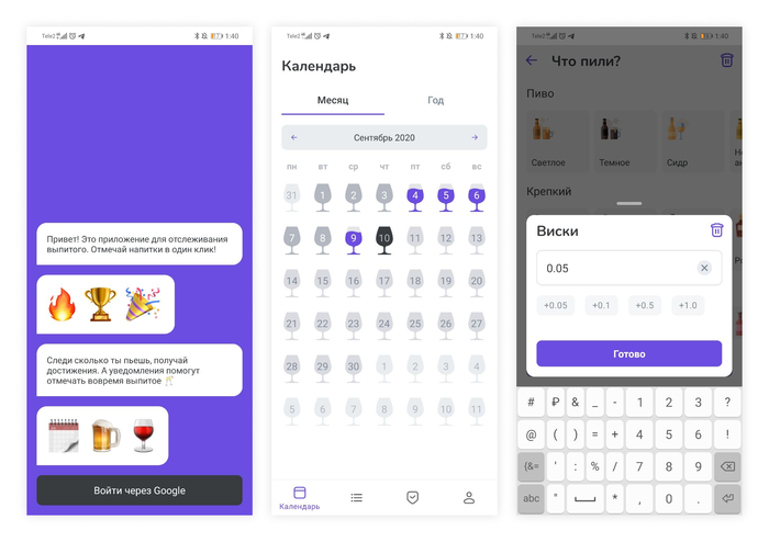 Приложение "DrinkDays" в Google Play. Упор сделан на то, чтобы максимально быстро отмечать дни, когда пьешь. Не обязательно отмечать напитки, что-то заполнять. Полный аналог бумажного календаря, только еще с уведомлениями.