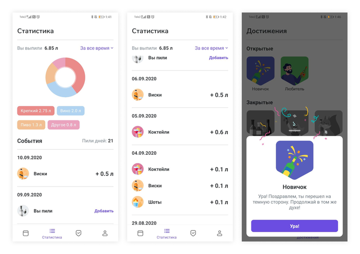 А если хочется большего, можно заполнять напитки, их количество и смотреть подробную статистику за период.