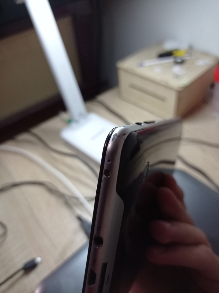 Первые впечатления были не очень, честно говоря. Тачскрин был сильно изношен, царапины, скол. Но не треснул - это главное! Планшет разбирали судя по трещинам на боковой рамке. И к тому же, он весь скрипит как дверь)