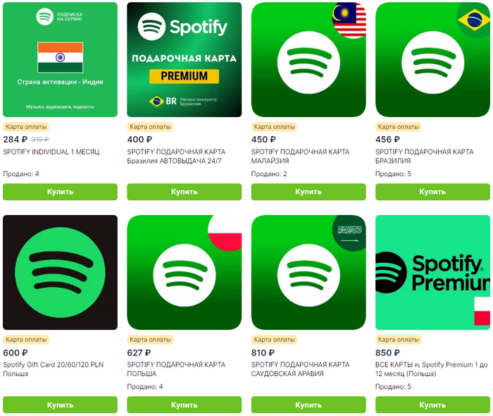 Подписку можно приобрести используя подарочные карты Spotify, но в России их нет, и для активации потребуется смена IP-адреса. Карты можно найти на торговой площадке GGSel. Чтобы их активировать, нужно зайти на официальный сайт Spotify и ввести указанный код.