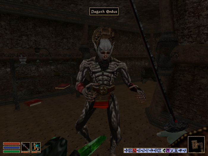 Можно вспомнить и про пепельного вампира по имени Дагот Эндус. При виде героя он сразу же пытался его атаковать, но если вам удавалось какое-то время уклоняться от боя, то в какой-то момент появлялась возможность начать разговор. В ходе беседы Эндус выдавал нам бутылку древнего бренди, которое при употреблении понижало интеллект и силу воли. Потом, правда, этого вампира все равно приходилось убить.