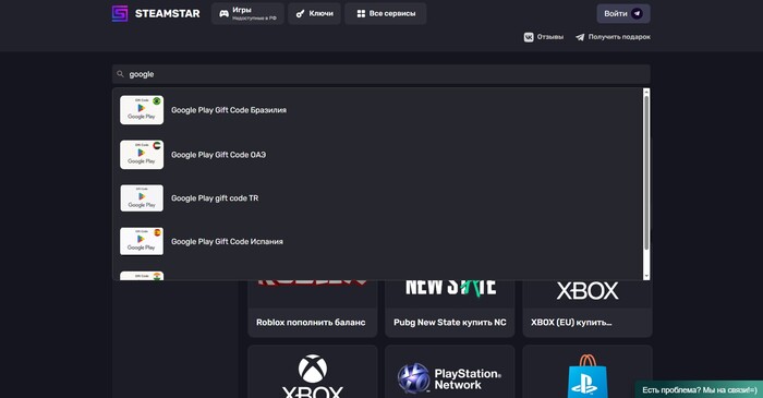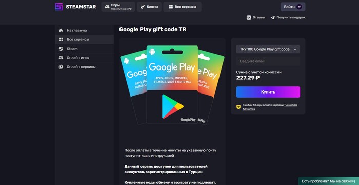 Steamstar — отличное решение для тех, кто хочет купить код Google Play или пополнить баланс без ограничений. Платформа предлагает удобный интерфейс, моментальную доставку и поддержку, готовую помочь в любой момент.