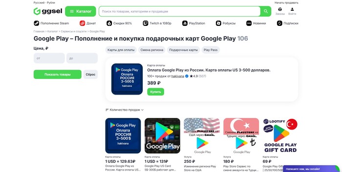 На Ggsell удобно выбирать предложения по курсу и рейтингу продавца, что особенно важно, если вы хотите купить код Google Play в России выгодно и без риска.