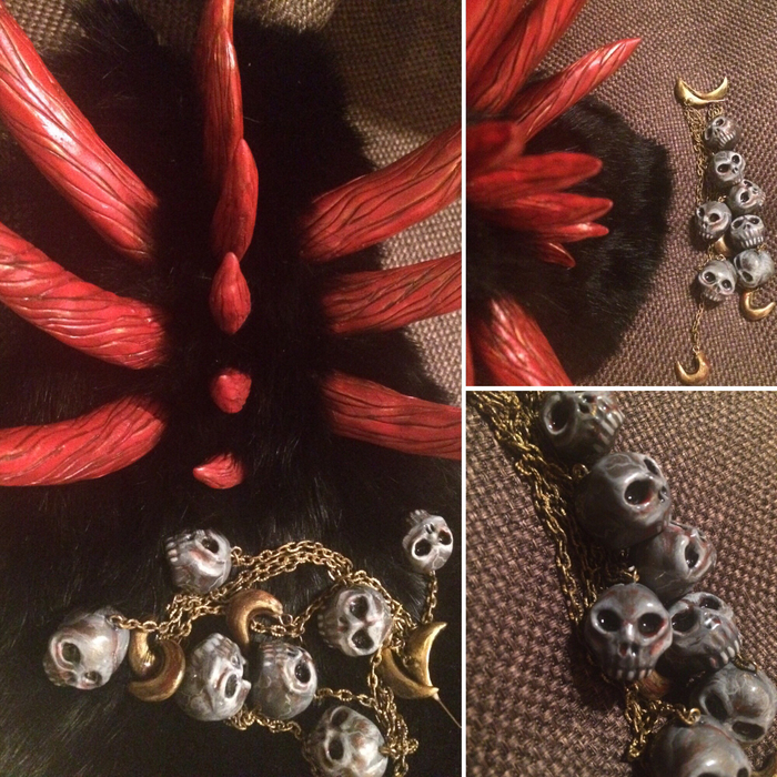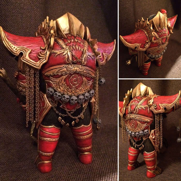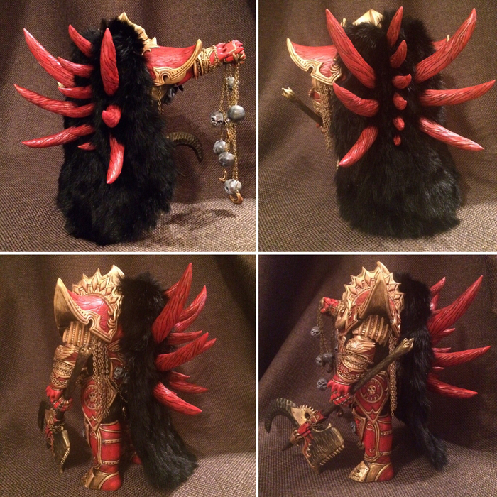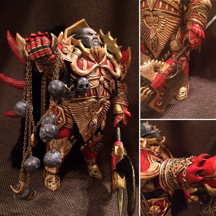 Ангрон🔥🔥🔥 Контрастный, массивный, яркий! С таким количеством мелких деталей , что можно долго рассматривать... Есть и съёмные элементы : связка с черепами и меховой плащ. Каждый череп на связке имеет внутри загнутое крепление, на которое наращивался сам череп. Плащ на проволочном каркасе ( на нем слеплены шипы), что позволяет самостоятельно сделать тут уклон шипов, который нравится ). Мех и кожа натуральные. Цепи на самой фигурке крепятся за счёт металических штифтов.