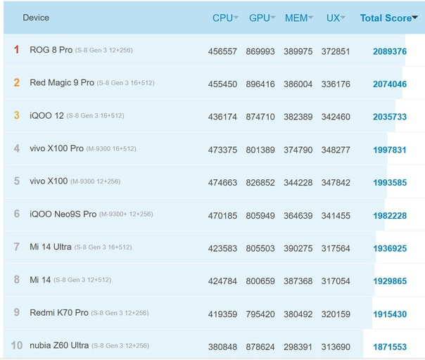 ASUS ROG Phone 8 Pro остается непревзойденным "игровым монстром", когда речь заходит о получении наивысшего балла в бенчмарках. С момента своего выхода в продажу он занимает первое место в рейтинге. Помимо мощного процессора Snapdragon 8 Gen 3, ROG Phone 8 Pro оснащен передовыми технологиями, которые включают большую испарительную камеру для лучшего охлаждения, светодиодные индикаторы на задней панели и сенсорные триггеры для лучшего контроля в играх.