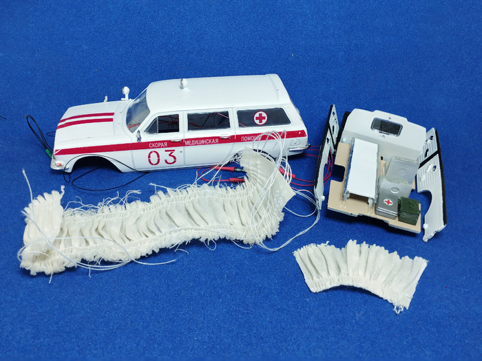 А ещё я попросил одну мою хорошую знакомую мастерицу, которая виртуозно шьёт детские игрушки, реализовать миниатюрные шторки с прошитыми складочками для внутреннего убранства медицинского салона модели «Волги».