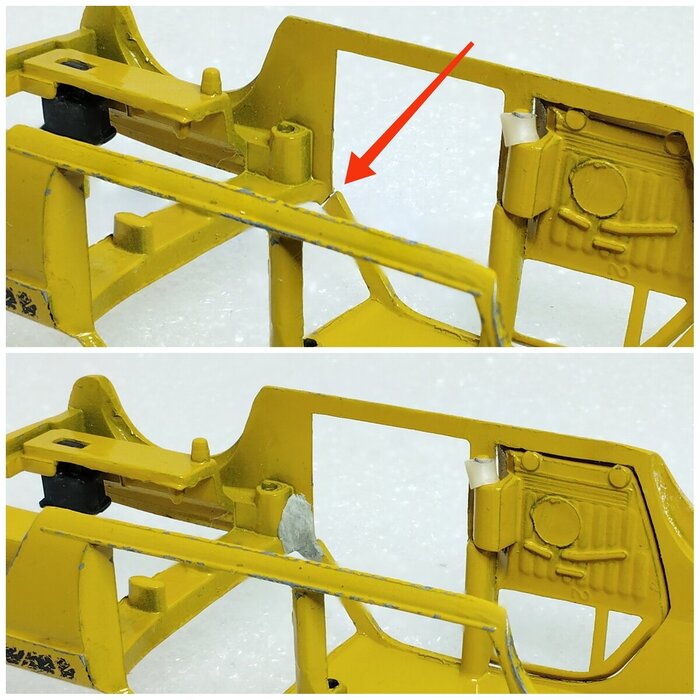 Перед сборкой возникла ещё одна проблема. Оказалось, что у детали с передними сидениями повреждено одно ушко для крепления боковой двери. Повезло, что в запасе была и эта деталь!