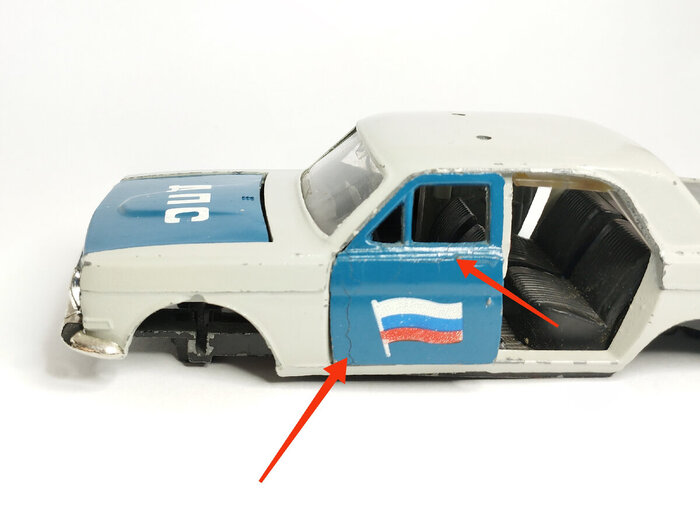 У оригинальной саратовской "Волги" ДПС был ещё один нюанс: на передних дверях методом тамповки был нанесён российский триколор 🇷🇺 (см. рис. 1 и 4). Никаких проблем - сделаем и его, благо есть соответствующие переводные наклейки. После перевода наклеек, не забываем защитить их поверхность любым глянцевым лаком!