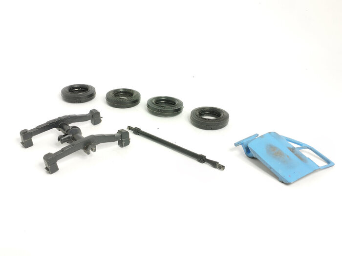 Вдогонку к модельке приехали некоторые недостающие элементы: рессоры, карданный вал и целая водительская дверца. А новенькие покрышки я выделил из хомяковских запасов.