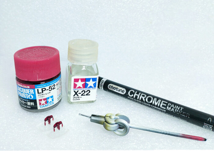 Задние фонари я покрыл алым лаком LP-52 (Tamiya), а ручку переключения КП жидким хромом и защитил эмалевым лаком Х-22 Clear (Tamiya).