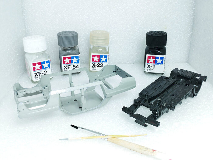 С донышком особых проблем не возникло: с помощью спирта я убрал все органические загрязнения, ацетоном устранил розовый лак и чёрной глянцевой эмалью Х-1 Black (Tamiya) закрасил все места со сколами и потёртостями.