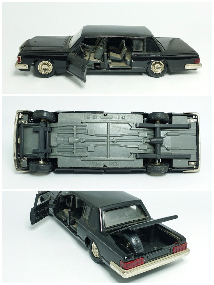 Модель "Волги" с креплением передних и задних дверей в пластиковую деталь салона, а не в отверстия в донышке, разбирается несколько проще. При снятии металлического дна, штыри дверей остаются сидеть в своих гнездах и минимизируется вероятность их случайной поломки.