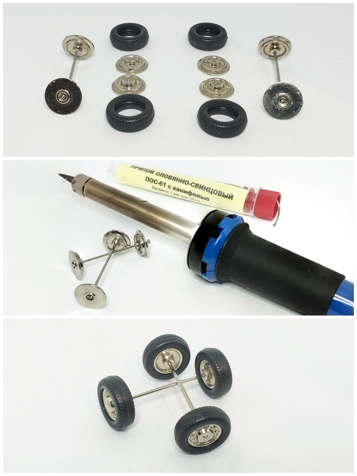 Для начала я собрал для "Волги" новые оси с её родными колёсными дисками и покрышками.