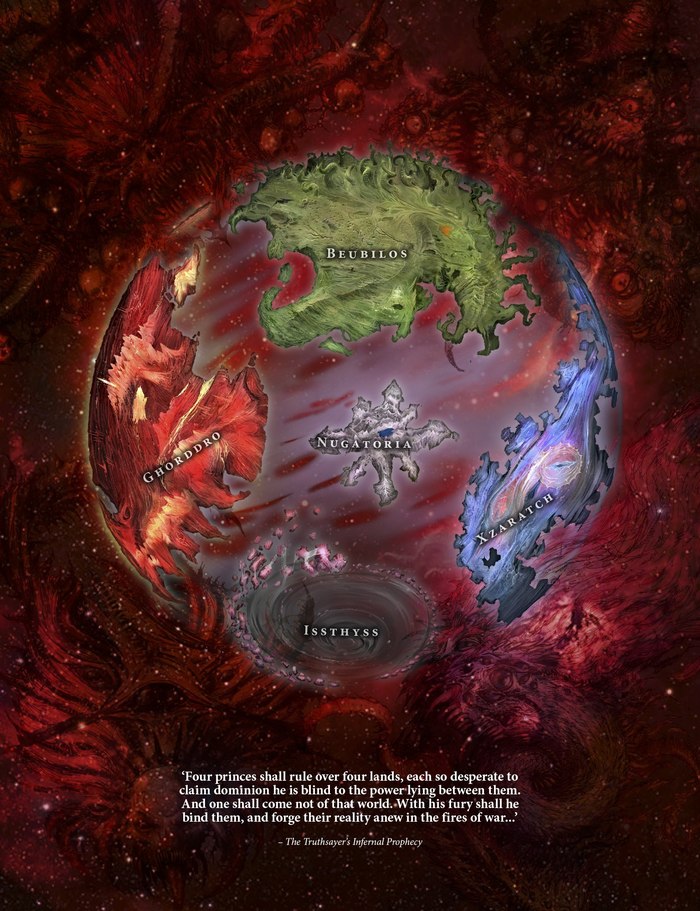 Встречаются и, так сказать, гибридные варианты. Космические просторы над Акши бороздит Orb Infernia. Orb Infernia представляет из себя четыре континента, образующих пустотелую сферу с пятым континентом в центре. На центральном континенте располагаются Врата владений ведущие в Пеплоземье. Некогда этот причудливый мир населяла процветающая цивилизация старателей и ремесленников, активно торгующих с землями внизу. В Эпоху Хаоса этот мир захватил Архаон, отдав его четырем вечно грызущимся демон-принцам и превратив в мобильный демонический мир.