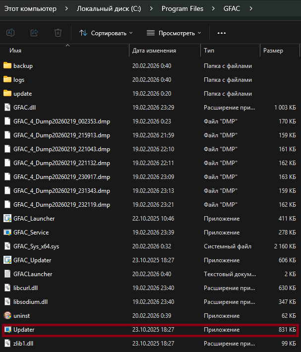 В первой папке запускаем Updater (не перепутайте с GFAC_Updater, а то запустится такое же окно с незавершенным обновлением)