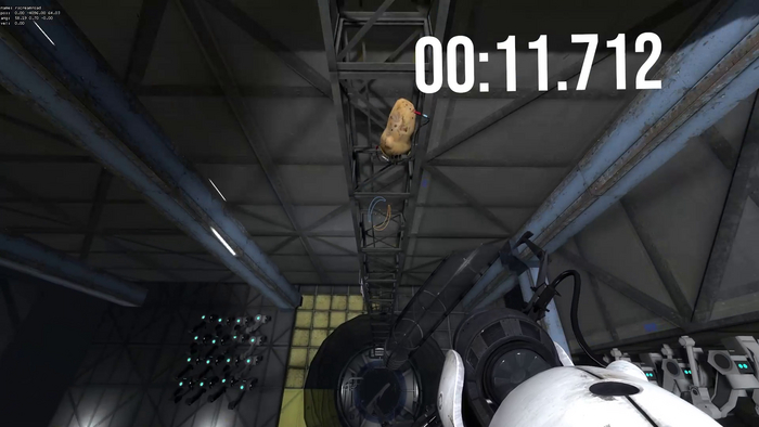Первый и самый очевидный способ: зная скорость и время падения мы можем высчитать пройденное расстояние. Объектом нашего исследования станет карта sp_a3_00. Сперва перейдём на требуемую локацию, и сразу же откроем консоль. Теперь введём команду, которая добавит нам к экрану информацию с нашими координатами, и также будет нам показывать информацию о скорости перемещения. Теперь нам нужно лишь засечь время, снять игру с паузы и дождаться падения. Проведя все требуемые расчёты мы получим требуемую цифру.