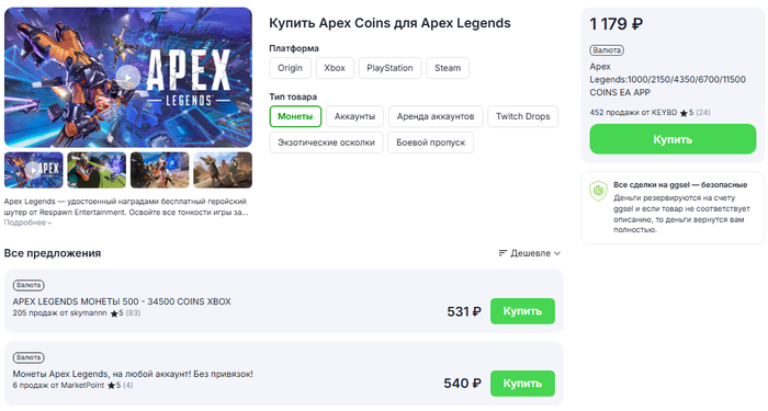 Теперь к самому прямому и простому пути. На ggsel.net вы можете купить монеты Apex Legends без танцев с бубном. Всё максимально прозрачно: заходите на сайт, вбиваете в поиск нужные монеты, выбираете продавца и оплачиваете удобным способом. Никаких лишних шагов, регистраций или сложностей с регионами.