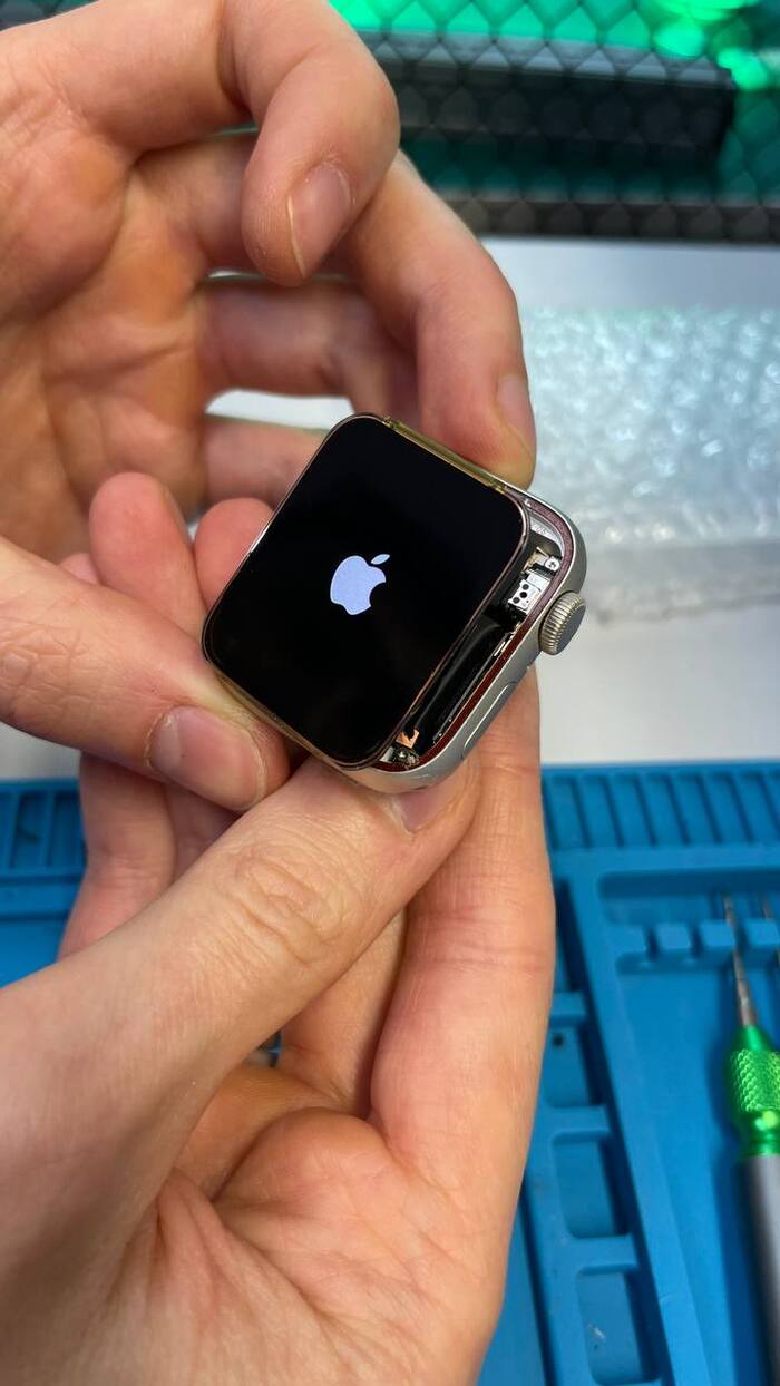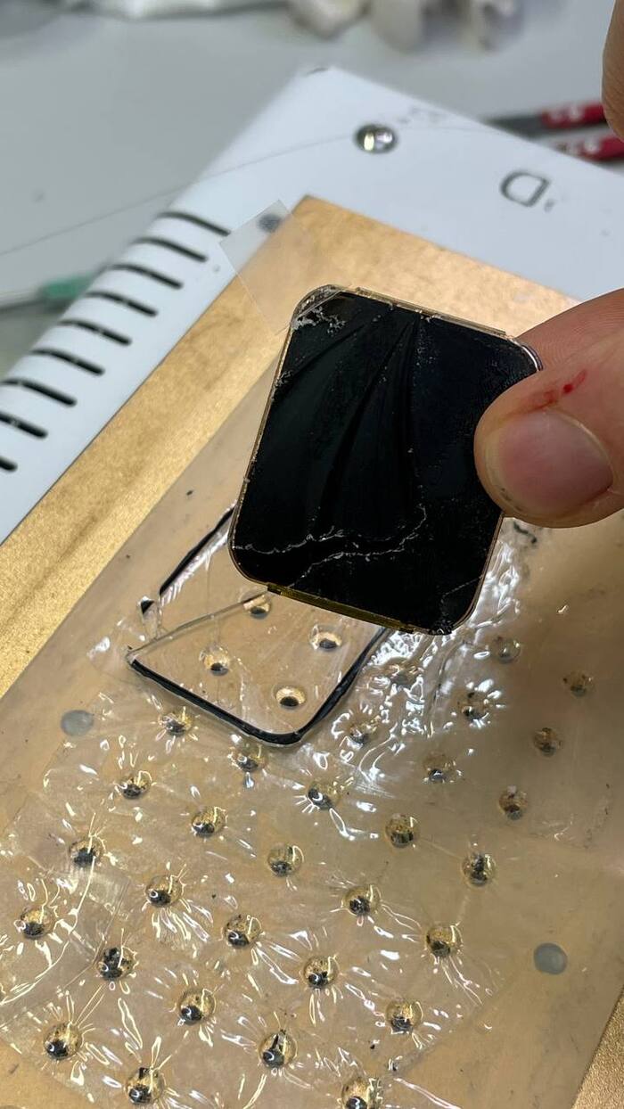 1 этап - разогреваем часы и снимаем дисплей. НО! Перед этим пинцетом убираем мелкие осколки с левого верхнего угла. Для чего? Эти осколки могут давить на шлейф или на матрицу и повредить дисплей при снятии.