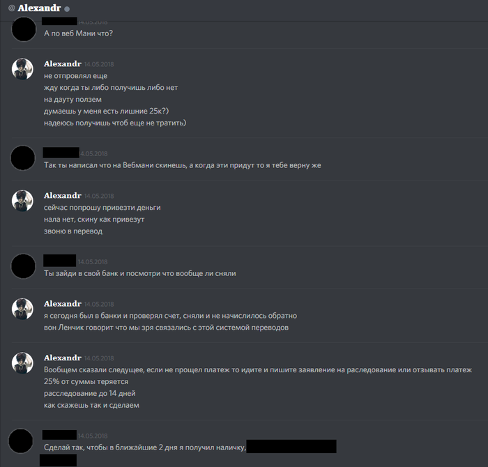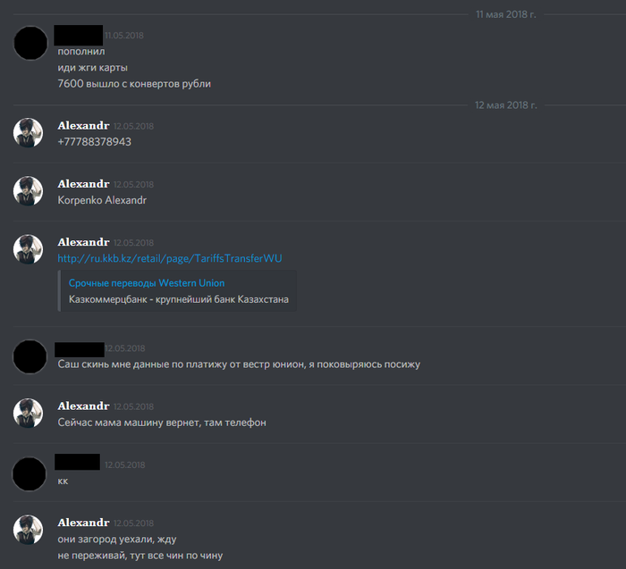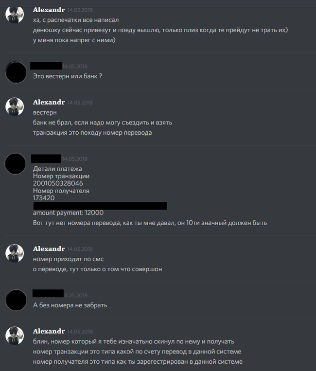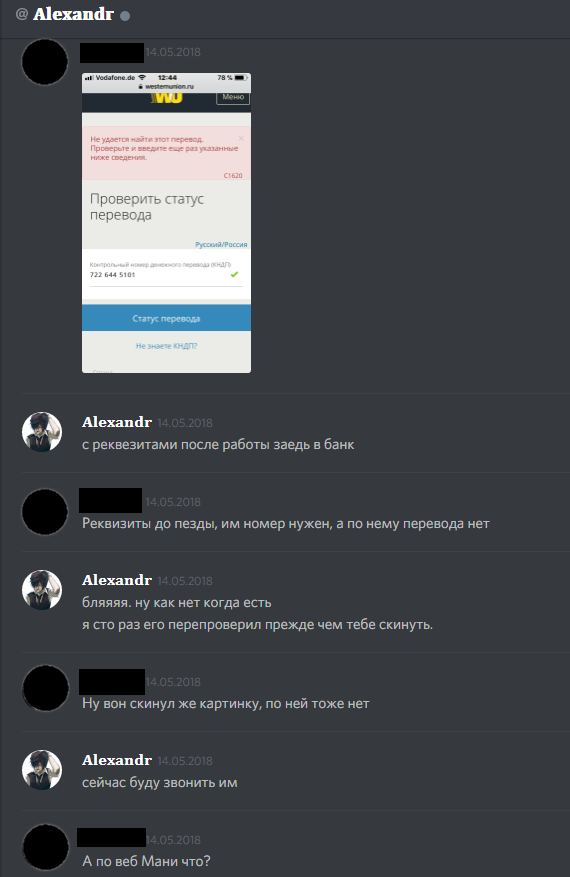 После чего мы отключились из связи, я еще раз подумал, стоит ли занимать человеку, взвесил еще раз все наше с ним общение - и пришел к выводу, что человек за все время был адекватным и вел себя порядочно. Решил таки занять ему денег. Зашел на следующий день с телефона на работе в дискорд и сказал, что вечером приду и скину ему тугрики, Вечером придя домой - взял у него данные от его игрового аккаунта, чтобы пополнить баланс со своего webmoney, после чего написал ему в личку, в дискорде, т.к. он попросил не освещать "наши дела" при девушках, окей, можно понять. На следующий день Саша мне сообщил в игре, что перевел деньги отдельно через Western Union, так мол будет быстрее, а когда придет банковский платеж, то я просто верну ему сумму на счет в игре. Саша дал мне свои данные и номер перевода WU(номер в дальнейшем из дискорда Саша удалил, не доверял системе) и я довольный иду на следующий день в отделение Western´а, заполняю бланк, отдаю сотруднику и узнаю, что перевода по такому номеру не существует. странно, захожу с телефона в дисскорд, обрисовываю ситуацию, еще раз прошу скинуть все данные по переводу, проверяю - все так, как заполнил на бланке, но система перевод не находит, звоню опять ему по дискорду, говорю так мол и так, Саша в свою очередь уверяет, что данные он считал с смс подтверждения и они верны. Возвращаюсь домой, захожу в игру, прошу Сашу в дисскорде скинуть мне его номер телефона и еще раз продублировать данные по переводу. На что Саша говорит, что телефон не у него, родители уехали и телефон остался в машине.