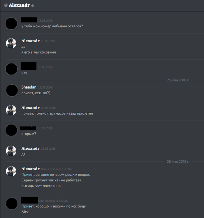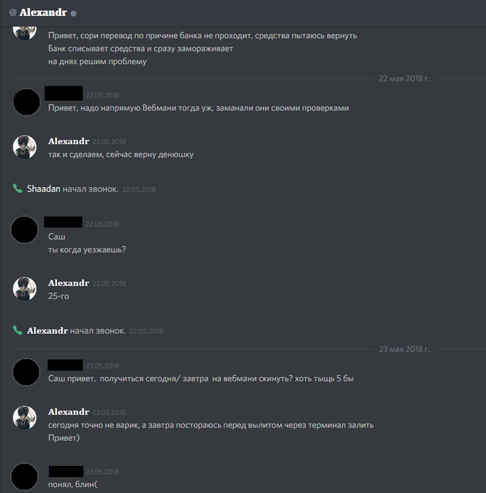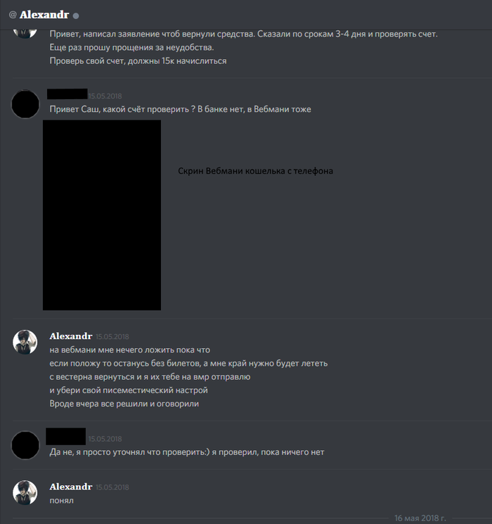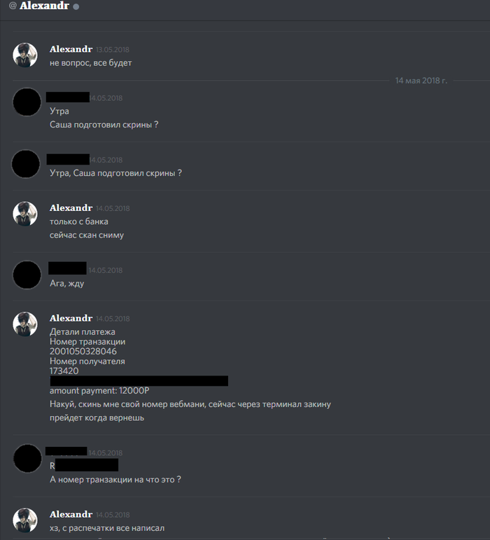 Играл я недавно в одну корейскую игрушку Archeage и так вышло - познакомился с одним там человеком, которого зовут Александр(игровой ник - Gopstopik, сервер - Невер) - человек взрослый и показался адекватным, стали общаться в игре. Есть там такая возможность - плавать по дну морскому и искать затонувшие корабли, в чем он мне вызвался помочь. за практически неделю поисков нужного мне корабля мы с ним начали общаться в дискорде(программа такая, аналог TS3, RC и т.д.) и выяснилось, что Саша в игре недавно, ориентируется не очень и периодически спрашивал у меня то да сё. Зато время, пока мы сидели в дискорде к нам добавилось несколько девушек из его круга общения и соответственно стали общаться все вместе. Как то раз Саша обмолвился, что играл ранее в другую игру и очень недурно вливал в нее реальных денег, ну ладно думаю - у каждого свой досуг. Тут в игре прилетела скидка на возможность покупки недвижимости, которую можно поставить в игре на определенном участке и выкрашивать на ней "картоху", можно конечно и обычный огород поставить, но "шоповская" недвижимость имела бонусы - налог на нее был меньше чем обычной постройки. Приобрести же подобную фичу можно было во внутриигровом магазине за кристалы, которые в свою очередь можно было купить либо за реальные, либо за игровую валюту на игровом аукционе. Заходим в дисскорд, как обычно и я Саше говорю: -Саш там акция в шопе, ты же хотел купить себе "пугала"!, а Саша мне отвечает -"Да блин, у меня пока напряг с деньгами, не могу вывести с карты". Я подумал, акция закончится через пару дней, жалко, средства в игре у меня были и решил помочь человеку, сказал что могу одолжить ему. На том и порешали, купили на аукционе кристаллов, поставили недвижимость, Саша сказал, что подумает, как закинуть ему денег в игру и вернуть мне долг. Дальше больше - захотелось ему купить "транспорт" в игре, есть там такие кабриолеты^^, "нашел" - говорит покупателя, договорился подешевле, -"займи, пожалуйста N-сумму игровой валюты,отдам потом все сразу". Ладно, думаю, транспорт вещь нужная, пригодится в совместной игре, говорю Саше -"Сань, занять могу, но ты смотри там уже прилично будет возвращать" -"Не вопрос, все отдам, не переживай". Окей, купили мы этот кабриолет, человек радуется, первым же делом - поехали кататься. Проходит пару дней, захожу вечером в дискорд, как обычно, Саша радостный просит банковские данные или яндекс, чтобы скинуть тугриков, вернуть долг. Дал данные, сперва яндекс и говорю: -"закинуь для проверки рублей 50, как придет - закинешь остаток", деньги ждали почти два часа - в итоге Саша попросил банковские данные и через несколько минут сказал, что деньги ушли, нужно ожидать, отправил даже больше, так сказать - за простой, за что просит прощения. Я в свою очередь радуюсь и говорю, что мол "да ладно, мог бы нужную сумму скинуть, лишнее не нужно", Саша меня уверяет, что все окей - он так хочет. Подождали пару дней, играем, общаемся - все хорошо и тут перелетает очередная бонусная программа на пополнение счета в игре, за которую еще и дракона можно получить!!!. Саша в дискорде утаскивает меня от девчонок в личку и спрашивает -"У тебя есть что по рублю? Хочу на акции получить дракона попробовать". Говорю: -"Сань, херня это все, да и не факт что там можно получить этого дракона, да и нету у меня лишних на кошельках", Саша начинает уверять, что это реально и просит зан