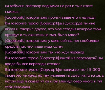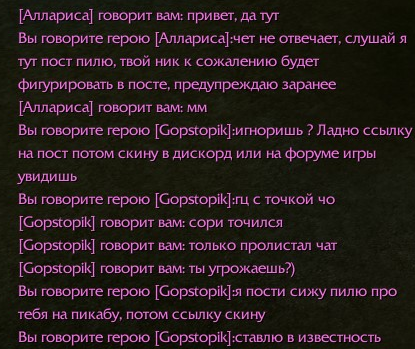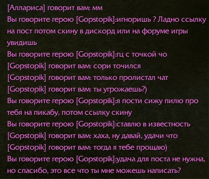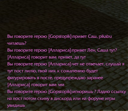 Захожу вечером 14го в игру, нахожу Лену(Аллариса) и спрашиваю ее в личку, в курсе ли она что Саша у меня занимал деньги? Она говорит, что да, что то там про переводы слышала краем уха, но что к чему не в курсе. Обрисовал ей ситуацию, предупредил на счет Саши, чтобы была с ним на чеку и спросил не занимал ли он у нее денег, сказала, что нет не занимал. Окей, попросил Лену пока оставить этот разговор между нами. На следующий день: