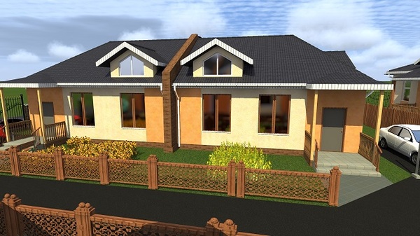 Ну и картинку домика вам напоследок. Дуплекс (дом на два домовладения), Нижегородская область, коттеджный поселок. ArchiCAD + Artlantis.