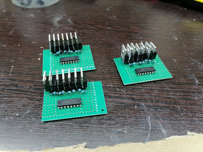 Наступило время сборки. Подключил все по схеме, но матрицы вели себя чрезвычайно странно: то не отображали ничего вовсе, то показывали какую-то белиберду; в общем, было очень неприятно. В итоге спустя полдня мучений и один убитый логический конвертер я решил забросить это дело на неопределенный срок.