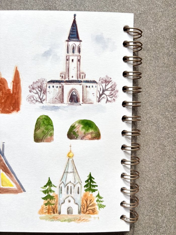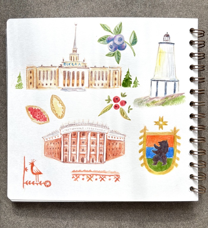 Сделала скетчи разных мест - Петрозаводский вокзал, гостиница Северная, Рускеала, Петроглифы, маяк Бесов нос, Воттоваара, Лумиваара и всякую другую ерунду