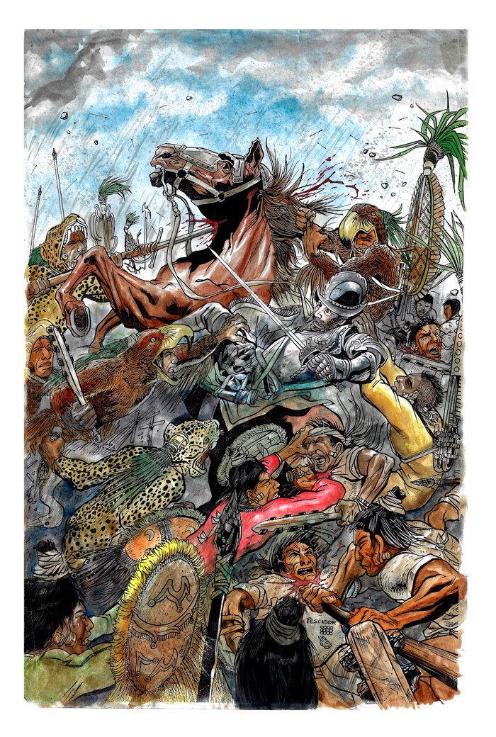 «Падение Теночтитлана» (La Caída de Tenochtitlan), рисунок Хосе Луиса Пескадора (José Luis Pescador) 1998 года, раскрашенный им же в 2024.