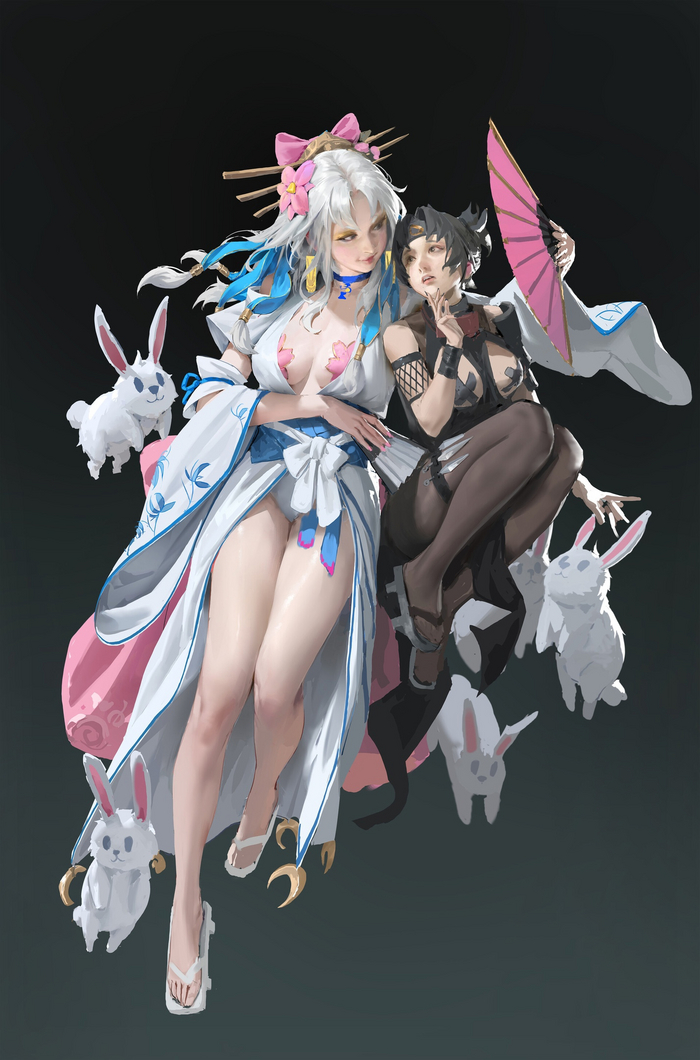 Сама работа с технической точки зрения сделана на отъ*бись. Волосы на хвосте и ногах - фибермеш. Половина персонажей развернуты как попало, а некоторые детали просто хайполи. По хорошему надо всё ретопнуть волосы перевести в плашки, но я слишком ленив для этого дерьма.