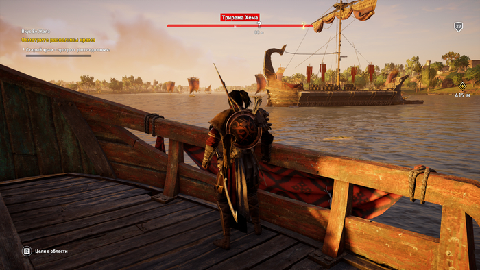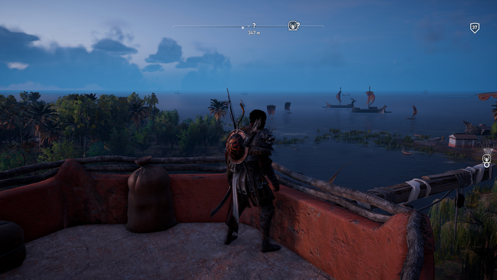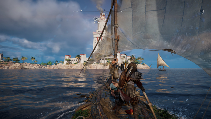 А ещё море! Корабли. Всего пару раз и то по сюжетке мне предстояло плыть на корабле и топить вражеские судна. В Одиссее же возможности расширили и игрок мог плавать по морям и озерам сколько угодно, топить чужие корабли сколько влезет и лутать с них хоть жопой ценные ресурсы. В Истоках за потопление корабля не дают ничего, кроме xp за выполнение задания в целом.
