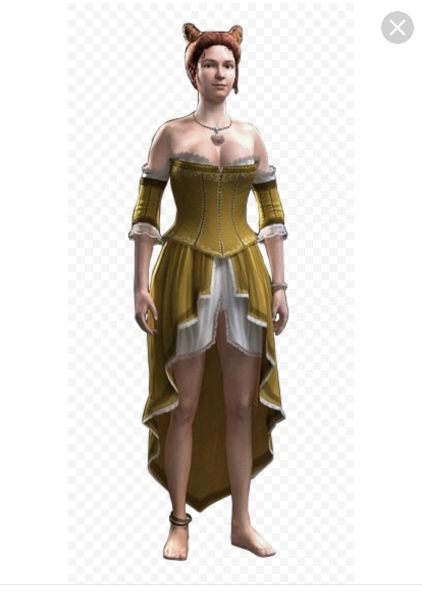 Внешний вид у этих неигровых персонажей отличается лишь цветом платья и волос. Это всегда укороченная спереди юбка (как ,действительно, и носили куртизанки) и корсет с кружевом.