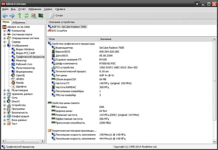 По техническим характеристикам видеокарта от GeCube еще больше обрезана от оригинала, скорее всего это связанно с использованием небольшого пассивного радиатора. Что мы имеем в итоге: Частота графического процессора составляет 148МГц, память состоит из 8 микросхем MORA типа DDR по 8 мегабайт каждая, что в сумме и составляет 64 мегабайта, работает на частоте 286 МГц по 64 битной шине.