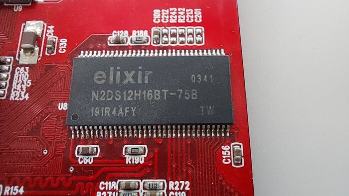 Оперативной памяти у нас тут немного, всего 128 мегабайт. Набрана память 8 микросхемами по 16 мегабайт производителя Hynix.