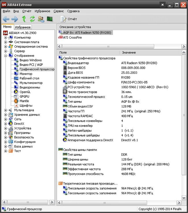 Частота графического чипа 241МГц, при этом AIDA радостно рапортует, что оригинальная частота 250МГц. Возможно, данная карта стала 9250 именно тупой перепрошивкой. Частота памяти 288МГц, которая, судя по AIDA, тоже занижена.