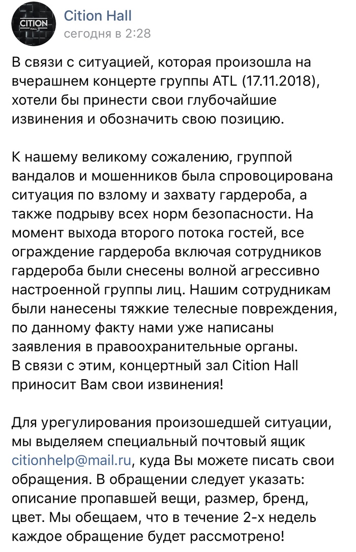 17 ноября 2018 года в Москве проходил концерт исполнителя ATL, организация концерта в начале была на среднем уровне, так как выступление началось на полтора часа позже запланированного, сам концерт прошел отлично, но дело не в этом, после данного мероприятия начался хаос. Охрана решила выставить железные ограждения и пускать по партиями, но эта идея провалилась еще в зародыше.