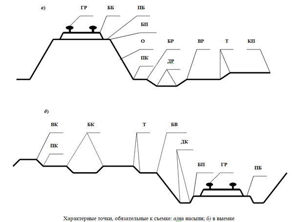 бровку земляного полотна (БП); точки перелома откоса насыпи или выемки (О); подошву насыпи (ПН); бровки резерва (БР); дно резерва (ДР); характерные по рельефу точки земли (Т); конец продольного профиля (КП); подошву и верх кавальеров (ПК, ВК); бровки канавы (БК);бровки выемки (БВ); дно канавы или кювета (ДК):