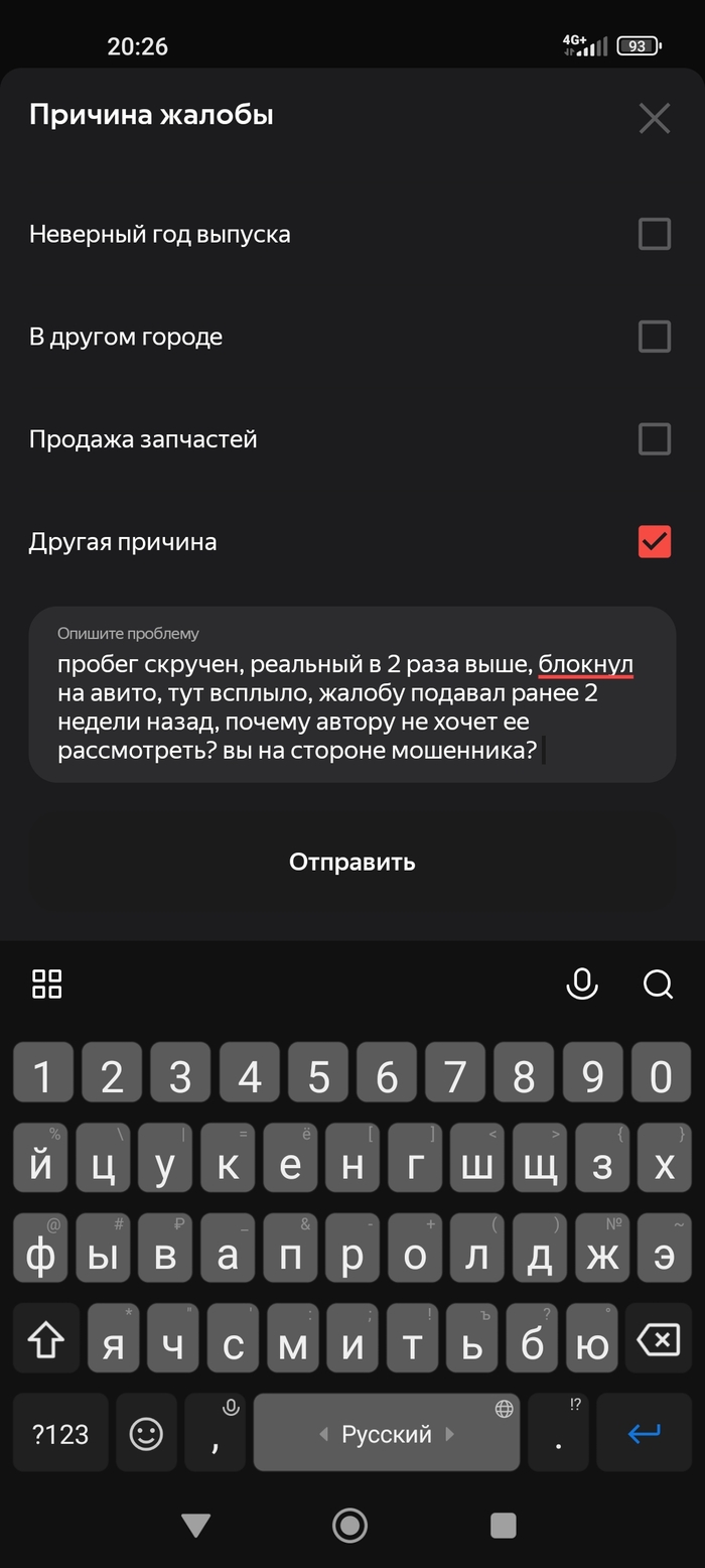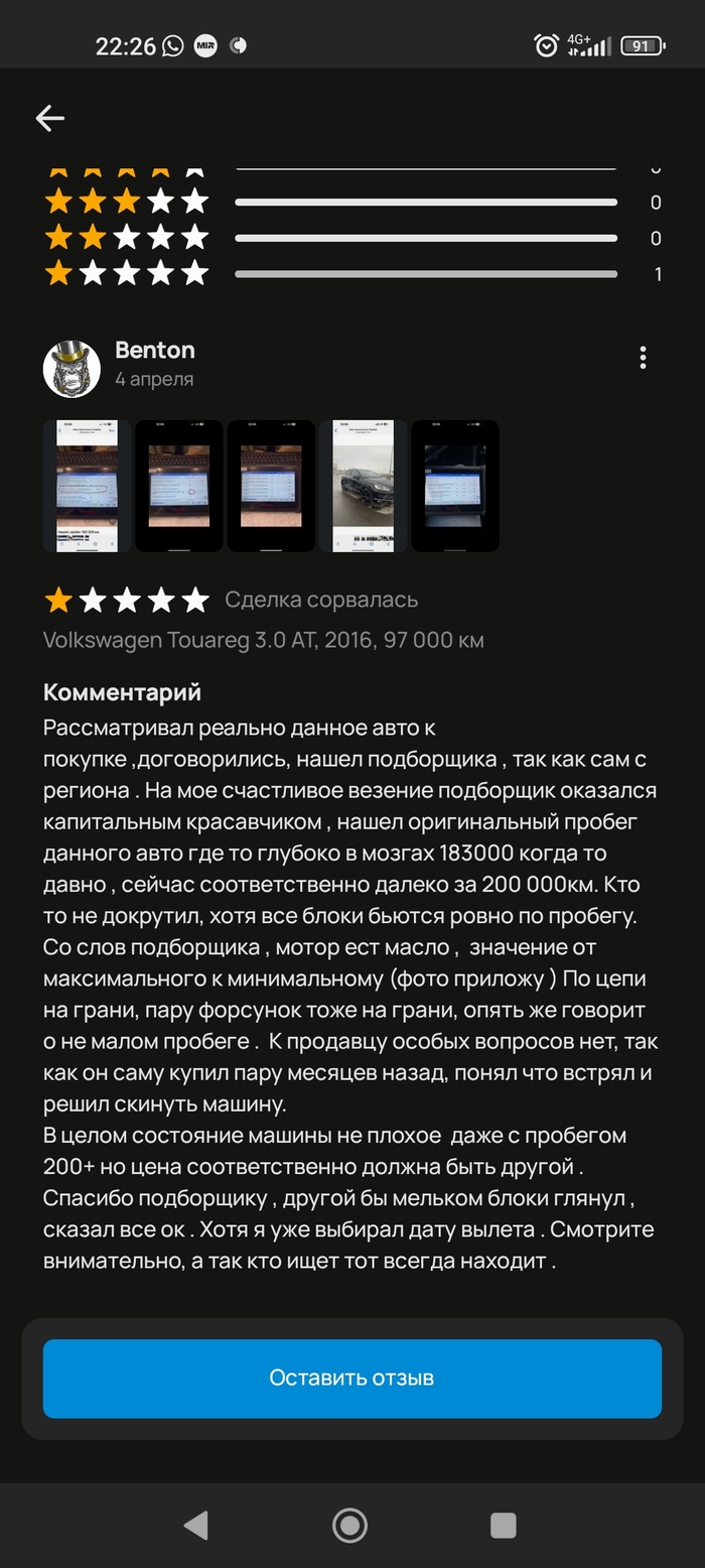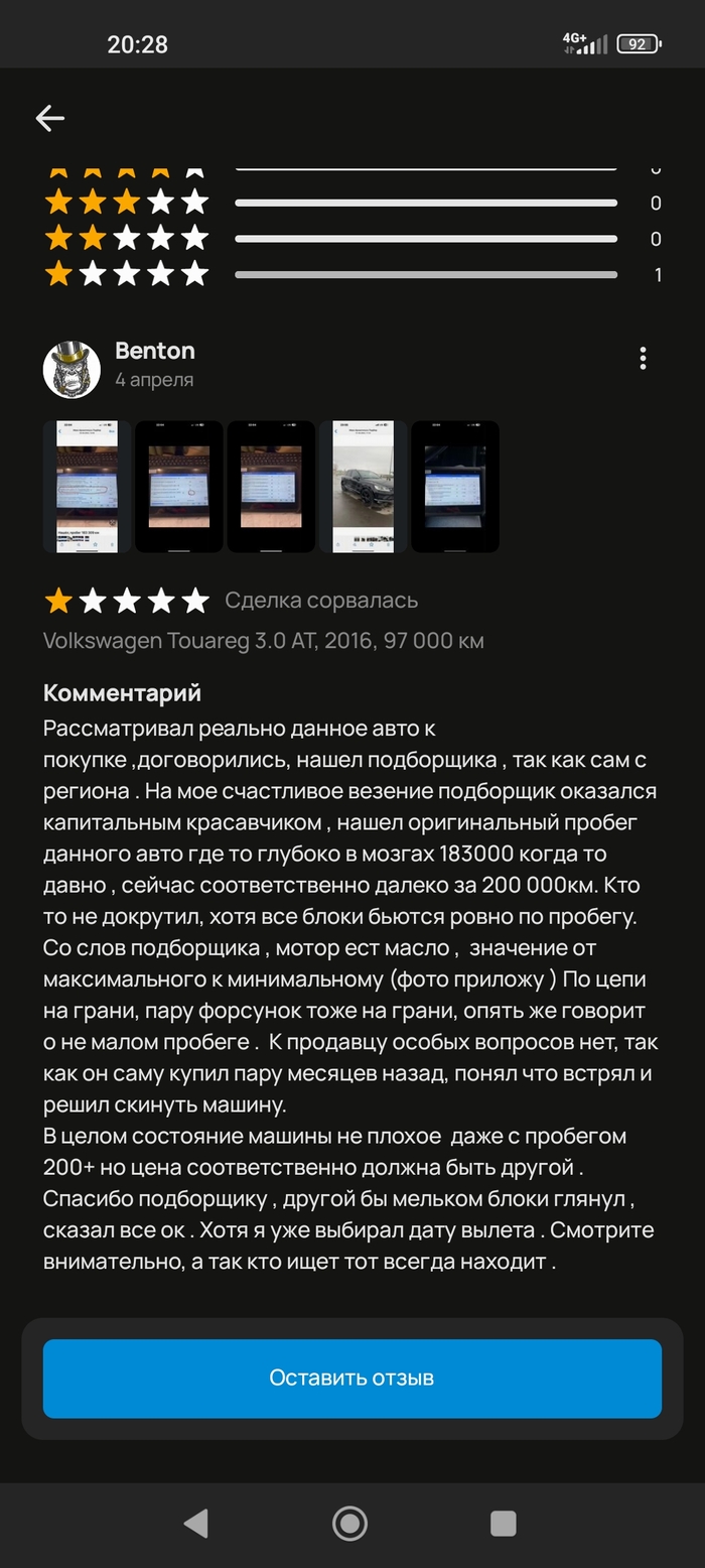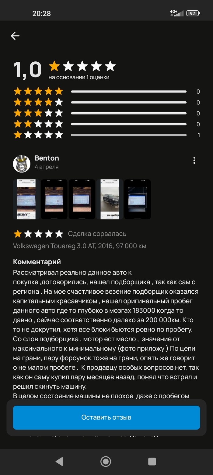 Было на авито объявление продажа туарега, пробег якобы 97000. Кто то решил проверить и нашлись проблемы с пробегом. Человек оставил отзыв и рейтинг продавана стал 1. Продаван слился и выставил объяву на автору. Я кинул жалобу, но прошло 2 недели, автору пофиг. Хотелось бы узнать, какой смысл кидать жалобы? Все скрины прикладываю