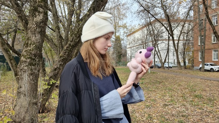 Этот человек моментально испарился, но мы решили не терять времени и приступили к вязанию. Чтобы сократить время, мы обе решили взяться за эту игрушку - решили вязать те детали, которые каждой из нас приятнее всего вязать.