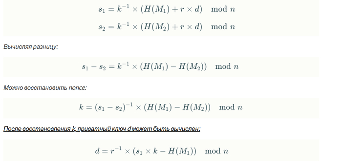 Данный математический аппарат демонстрирует, что единственное повторное использование nonce приводит к полной компрометации закрытого ключа.