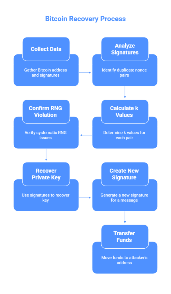 Этап 3: Восстановление приватного ключа d — применяя вычисленное k к любой из собранных подписей, атакующий полностью восстанавливает приватный ключ, что позволяет ему подписывать любые транзакции от имени жертвы.keyhunters+1