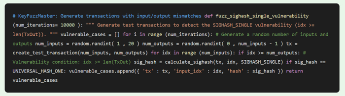 # KeyFuzzMaster: Генерация транзакций с несоответствием входов/выходов def fuzz_sighash_single_vulnerability(num_iterations=10000): «»» Генерация тестовых транзакций для обнаружения уязвимости SIGHASH_SINGLE (idx >= len(TxOut)).