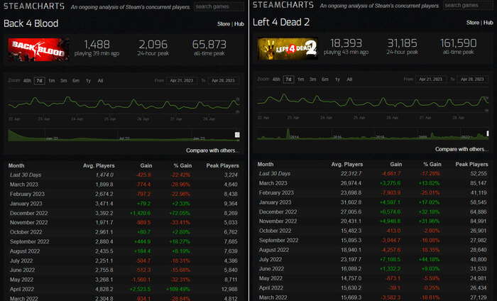 Может показаться, что я только и ругаю Back 4 Blood и брюзжу как старый дед, мол раньше было лучше. Но ведь это факт! И правда было лучше. Наглядно это демонстрирует статистика в Steam. У Back 4 Blood 1 500 средний онлайн, а у Left 4 Dead 2 – 22 000 игроков! А это игра, на секундочку, 2009 года! Вот и получается, что Turtle Rock не смогли повторить свой же успех. Да что там повторить, это почти провал. На релизе пик был всего 68 000 человек.