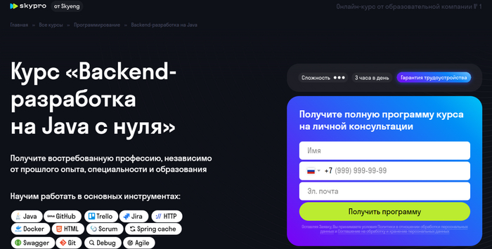 2. «Backend-разработка на Java» [SkyPro] — курс длится 11 месяцев. Учат Spring Boot, PostgreSQL, создание REST API, командную разработку. Практический курс по backend разработке с гарантией трудоустройства 100% по договору. Диплом гослицензии, рассрочка от 5 139 ₽/мес.