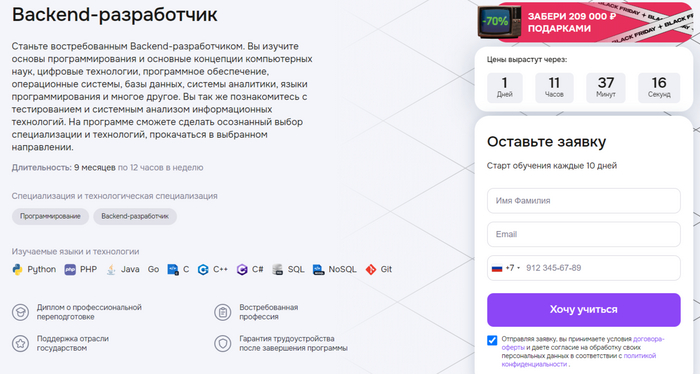 1.«Backend на Python» [SF Education] — курс за 3 месяца. Учат создавать API на Django, работать с базами данных SQL, DevOps и Docker. Практика на реальных кейсах, международный диплом ЕС. Курс backend с трудоустройством через карьерный центр. Скидка 65%, рассрочка от 4 958 ₽/мес.